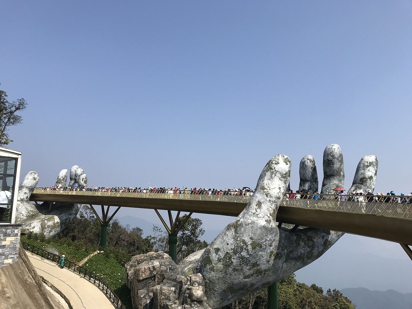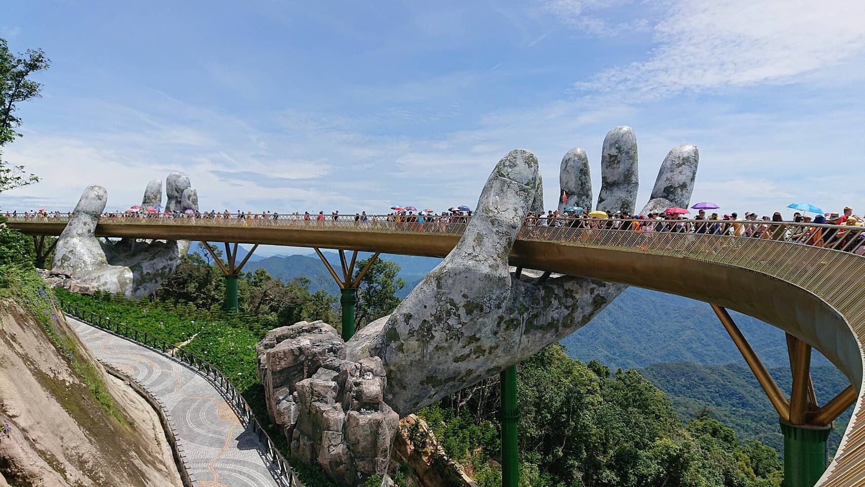 ケーブルカーに並んでいる最中、子供がトイレに行きたいと言って、ガイドとともに道をそれたら、戻って来たときに入れてもらえず、20〜30別室に閉じがられてしまった´д` ; その後、ガイドと共に警備のところへ行き、確実にチケットを渡して入場した事が判明し、なんとかケーブルカーに乗れました‼︎ ガイドさんが熱心に動いてくれて助かりました! ゴールデンハンドは人が多く歩くのもやっとですが、日本では見られない絶景や戦争後の廃墟もあり、新しいものと古いものが混在していて色んな思いを味わえる場所です また、上はディズニーランドの様に洋風な建物やマスコットやら色々なショウをしてくれる大道芸が次から次へと楽しませてくれますよ〜 平地よりも涼しくて過ごしやすかったです‼︎