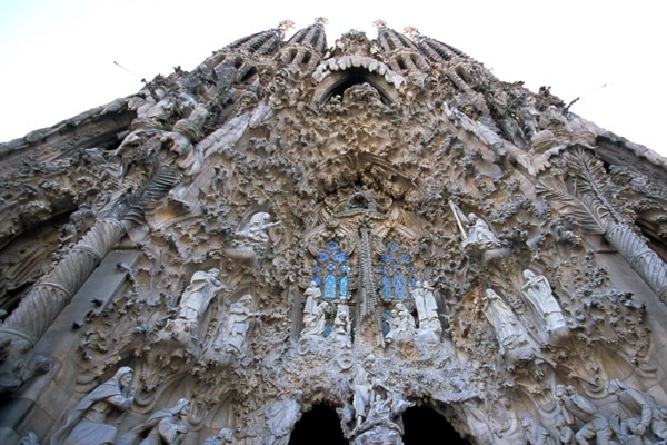 サグラダ・ファミリアに入場、日本人彫刻家・外尾悦郎氏の作品もある生誕の門の彫刻を日本語ガイドが説明。 |