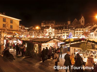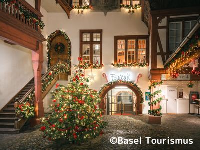 クリスマス期間中、17時を過ぎると、ライトアップされたバーゼルの旧市街はとてもロマンチックになります。