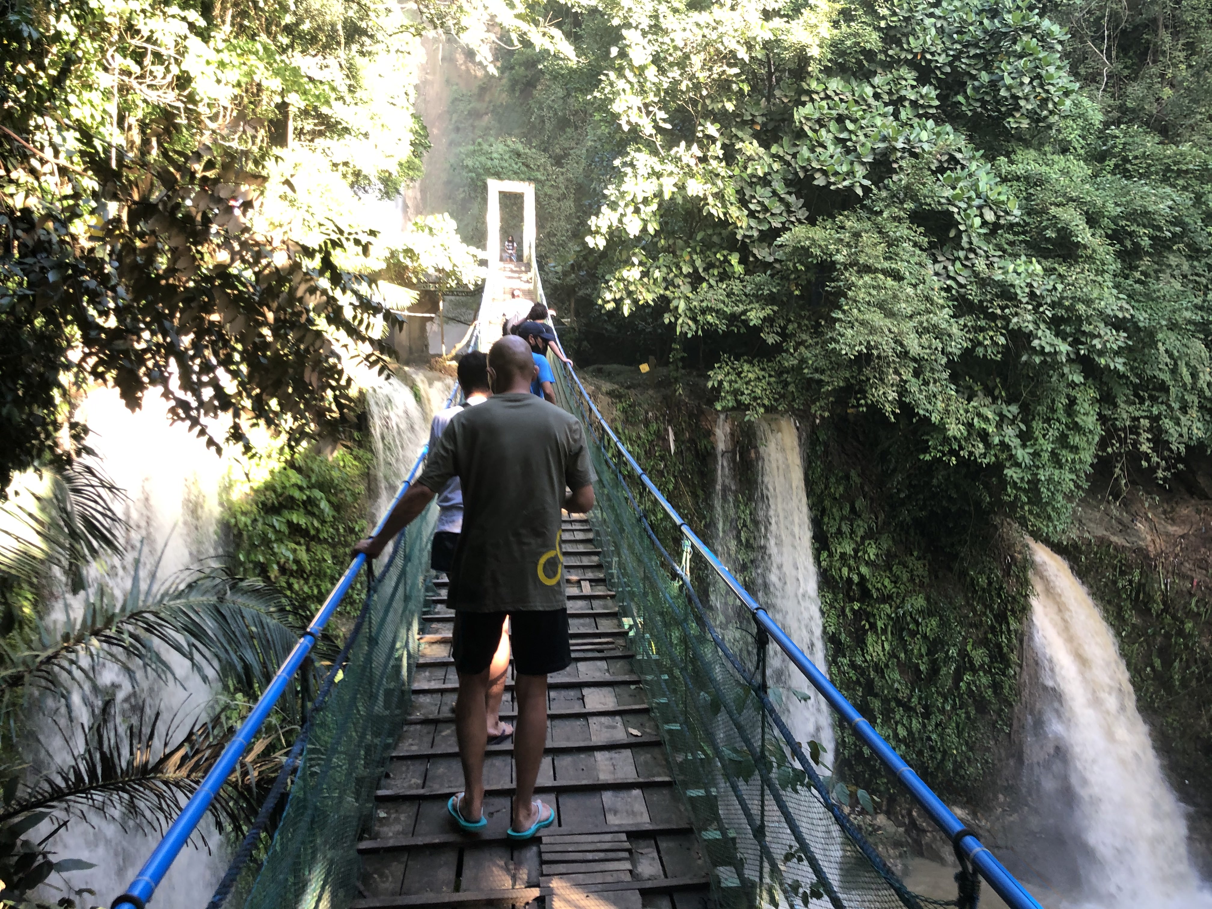 吊り橋を渡った先にあり、約98メートルの高さから流れ落ちる様子は、まさに圧巻です。