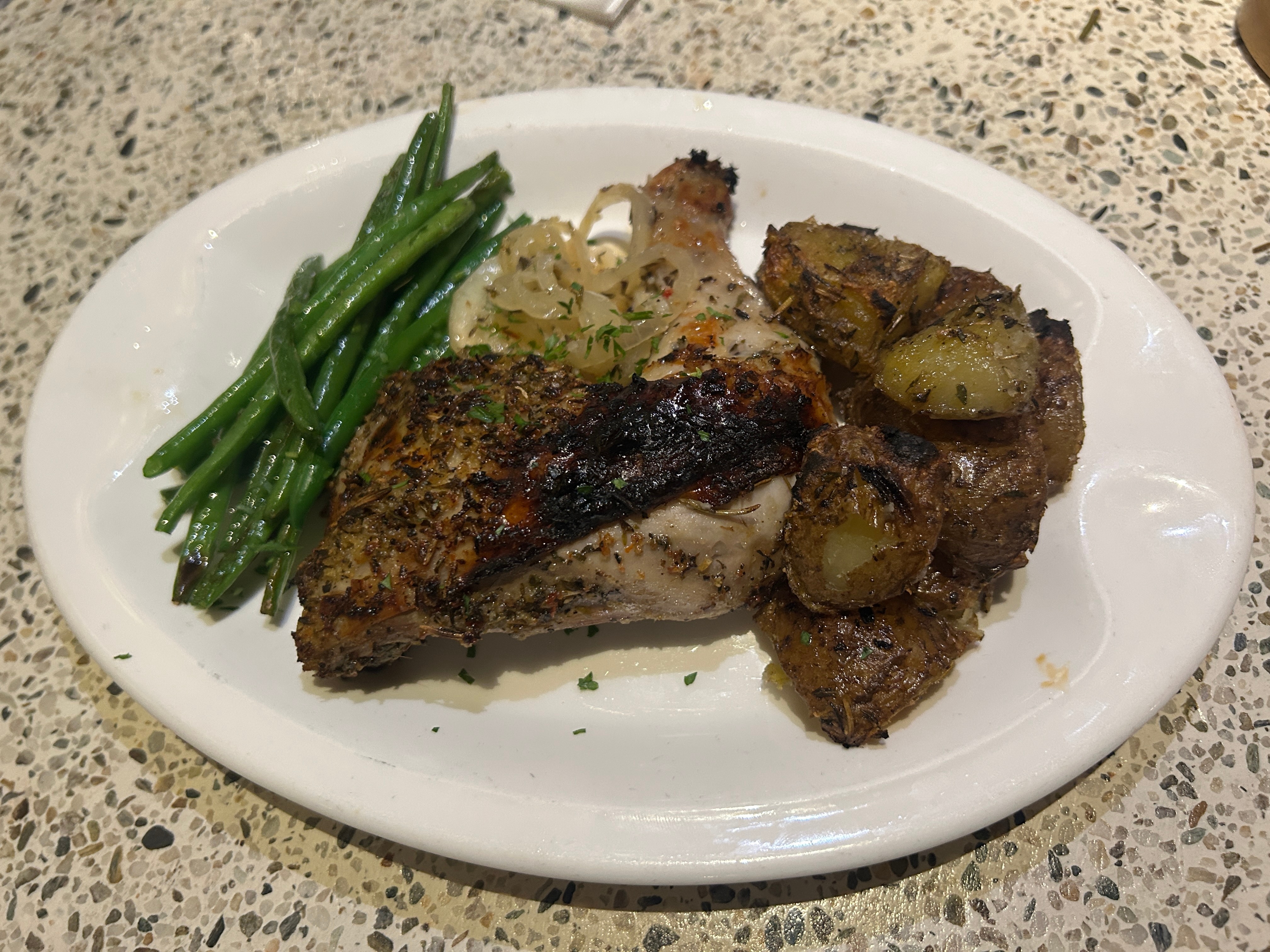ハーブローストチキンとローストポテト、グリーンビーンズの付け合わせ