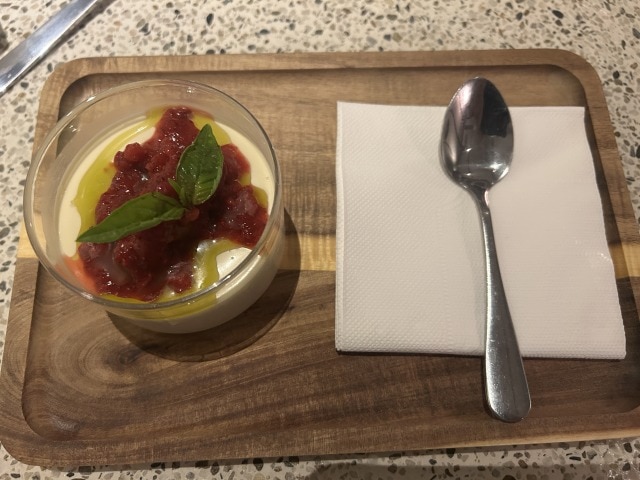 バニラパンナコッタ ストロベリーグラニータとバジルオイル、ミント添え