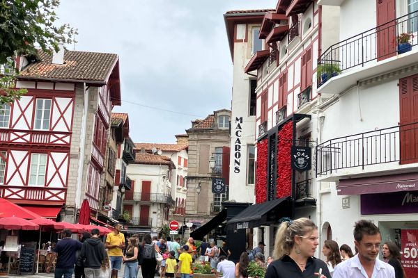 サン・ジャン・ド・リュズはルイ14世が結婚式を挙げた教会が残る港町。可愛らしい町並みを歩きながら、バスク織、マカロンや魚介の缶詰などお土産探しにも最適です。