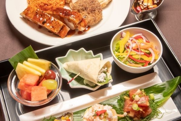 海老ケラグエン、チキンケラグエン、鮪ハワイアンポキ、ハム盛り合わせ、サラダバー、クラムチャウダー、リブアイステーキ、BBQポークベビーバックリブ、ラザニア、ミニハンバーグデミグラスソース、ケイジャンシュリンプ、タイグリーンカレー、シェフ特製カレー、夏野菜のオリーブオイル焼き、フライドポテト、シーフードパエリア、焼き立てパン、ご飯、温かいラーメン、冷やしうどん&トッピング、巻き寿司盛り合わせ、季節のフルーツ盛り合わせ、アイスクリーム