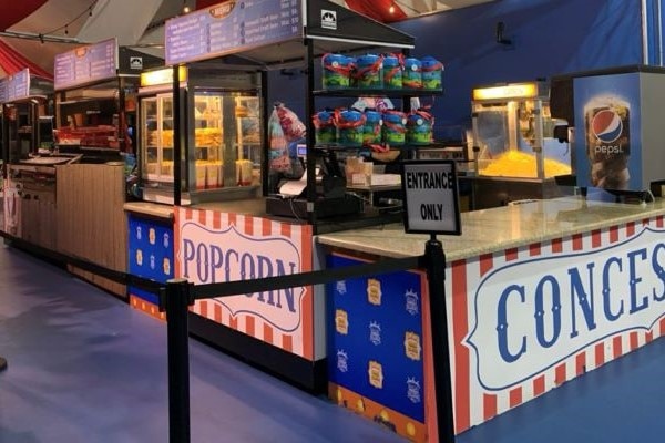 会場内に売店があり、ポップコーン、ホットドッグ、スノーコーン、ナチョス、コットンキャンディー、ソーダ、ノベルティグッズなどの販売がございます。