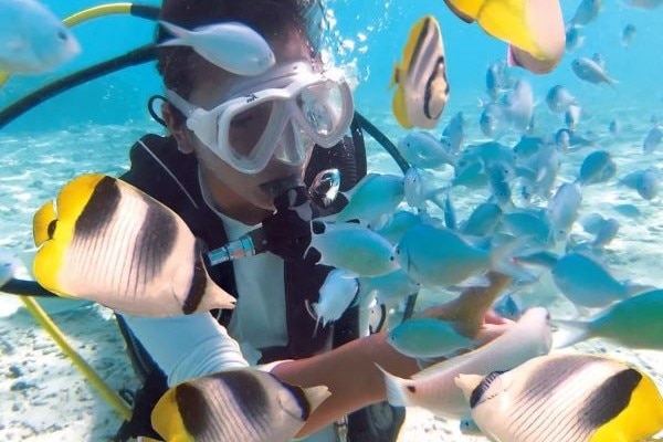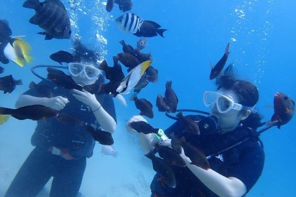 09:10(※1、2、3)、14:40(※1、2) ビーチ体験ダイビング開始 (潜水時間:約30分)水中では魚に餌付けをしますので目の前が見えないくらい魚が集まります。(最大深度:約12m) |