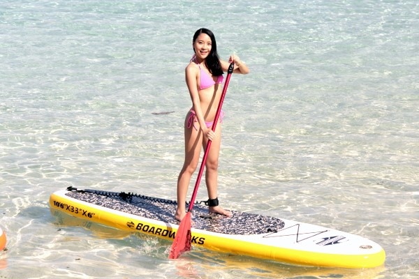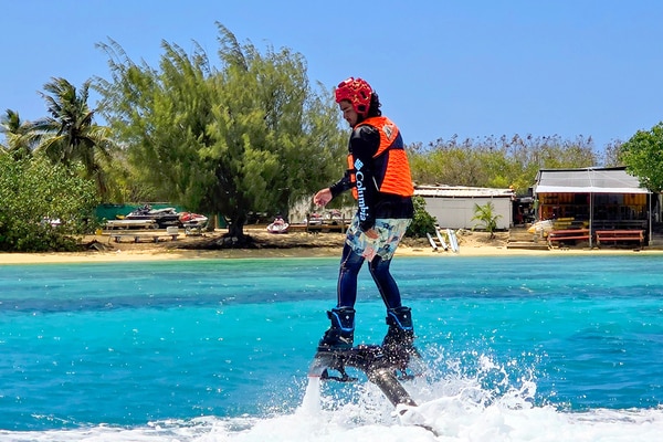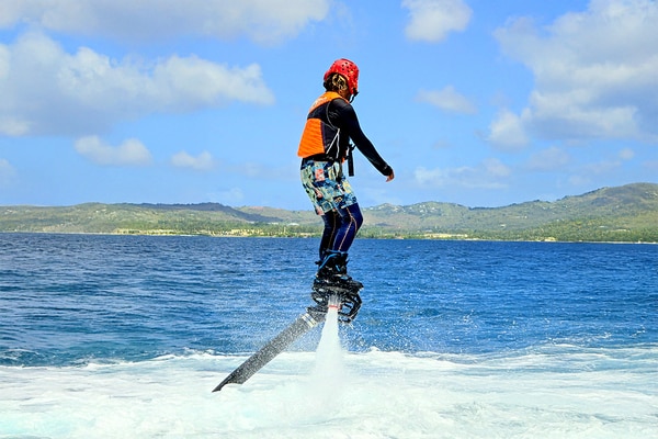 ジェットスキーの噴射口とつながれた特殊な道具を使い、足元から噴出される水圧によって海上に浮かび上がるアクティビティです。