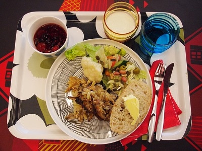 工場見学が終わったら、マリメッコ本社内の社員食堂にて好評のオーガニックランチを味わっていただきます。食器やカトラリーにペーパーナプキン、テーブルクロスまでもちろん全てマリメッコ。
