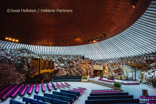 ヘルシンキ観光で人気のテンペリアウキオ教会は事前入場券がお勧め!岩をくり抜いて作られたユニークな教会は必見です。光に包まれる内部で北欧建築の傑作を体感しましょう。