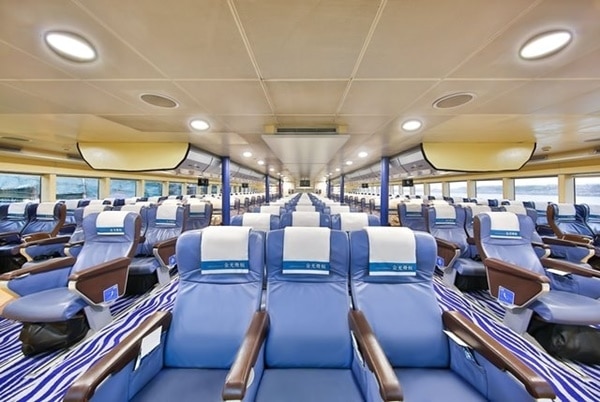 無料の軽食とドリンク付き。2階の専用キャビンで、より静かでゆったりとしたシートを利用できます。優先下船の特典があり、入国審査へいち早く向かうことができるため、時間を有効活用したい方におすすめです。