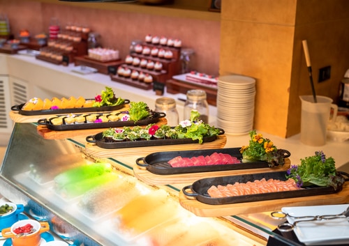 絶妙な火加減で焼き上げたプレミアム・オーストラリア産ビーフを中心に、氷上に並ぶ新鮮なシーフード、本格的なインド料理、そして作りたての寿司・お刺身など。