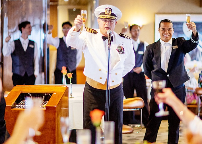 キャプテンのウェルカムレセプションでオードブルとスパークリングワイン、スープ、サラダ、活メインロブスター、プライムテンダーロインステーキ |