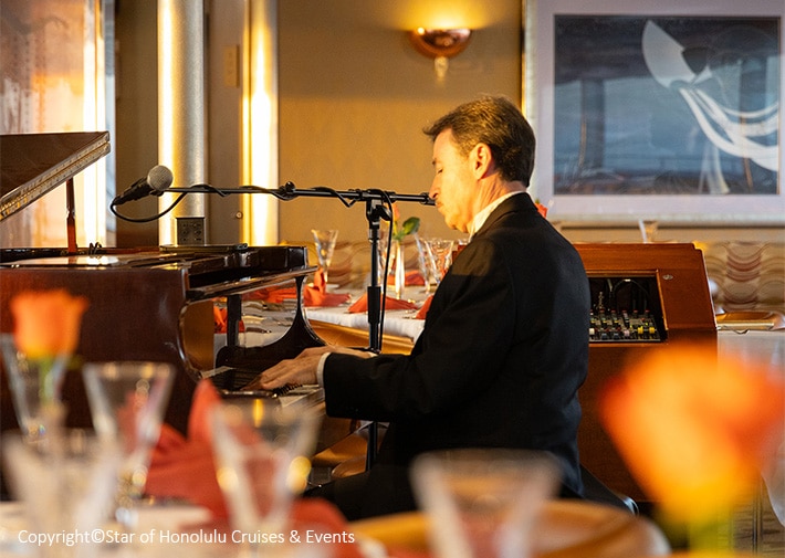 ハイライトショーは本格的なジャズライブ、食事中のBGMはピアノ演奏など、ダンスタイムもあり、ロマンティックでラグジュアリーな雰囲気のクルーズです |