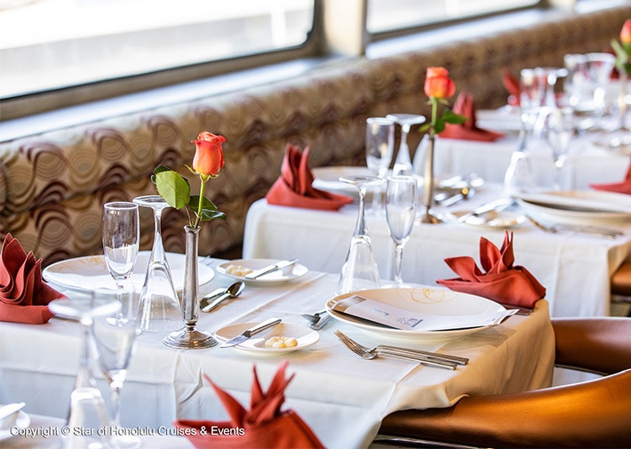【送迎付き】お客様に安定した乗り心地を提供するためのスタビライザーが搭載されている1500名乗りのスターオブホノルル号は「揺れが少なく食事もショーも楽しめる」と評判の豪華客船です。5スター用の落ち着いた空間でお食事とジャズの生演奏をお楽しみください。4階のデッキから美しいサンセットやホノルルの夜景も特別なハワイの思い出におすすめです。女性の参加者に贈られるバラのプレゼントはまさにサプライズ。特別な記念日になりそう。