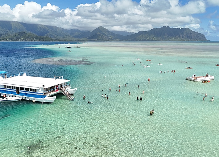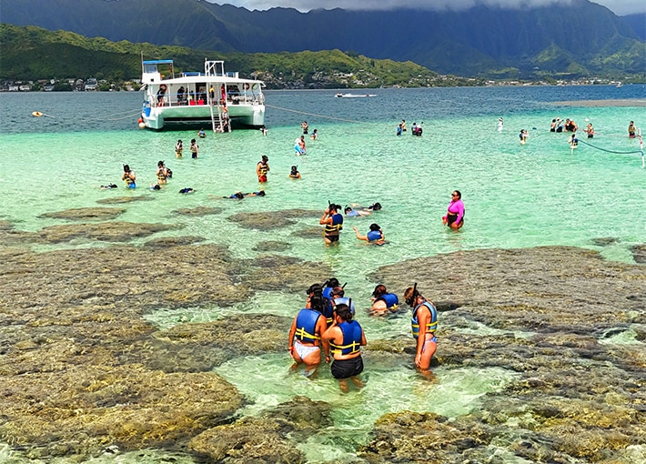 ワイキキ地区からの送迎、カタマランクルーズ、ライブミュージック、ドーナツ、お水またはジュース、消毒済シュノーケリングマスク、ライフベスト