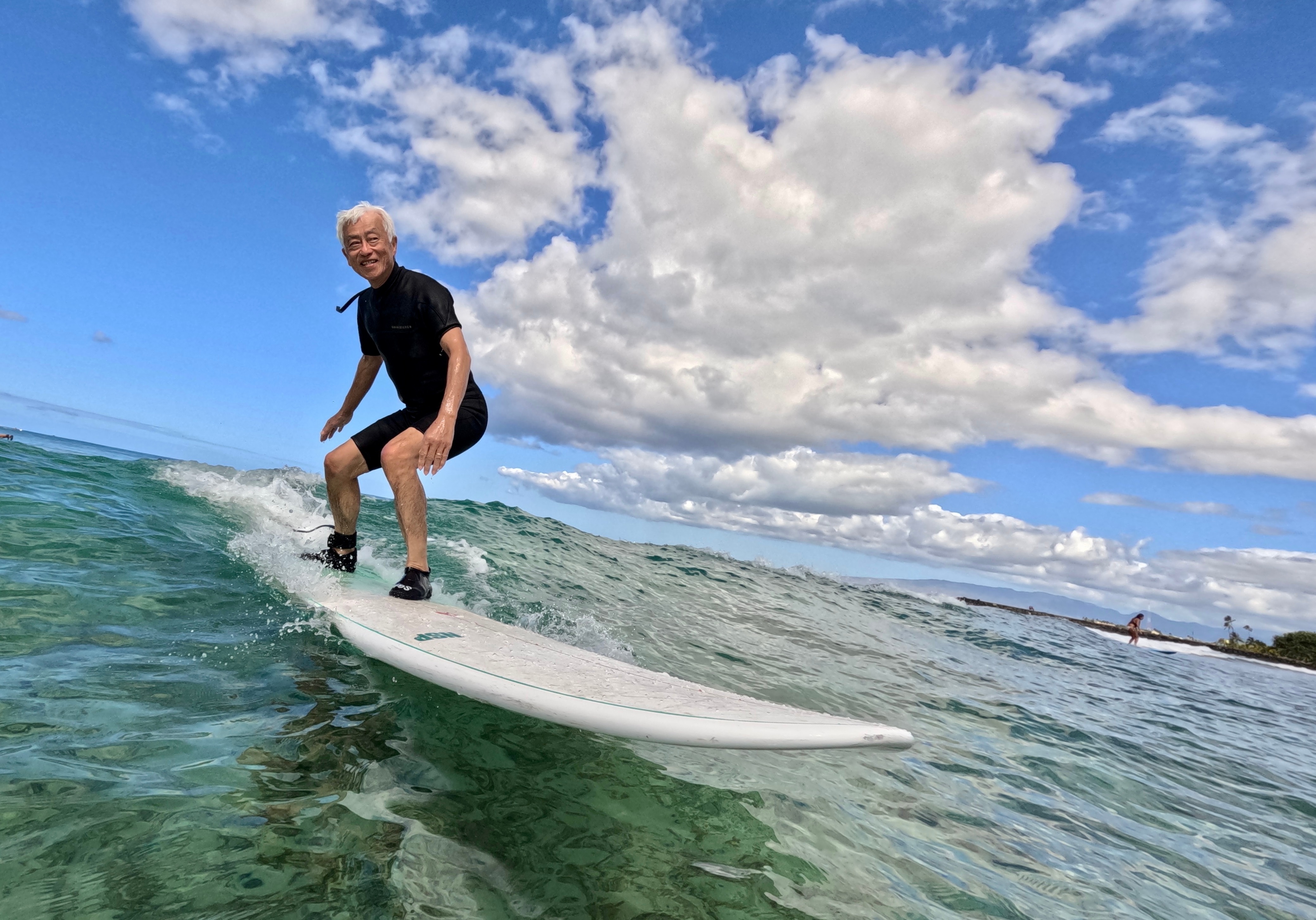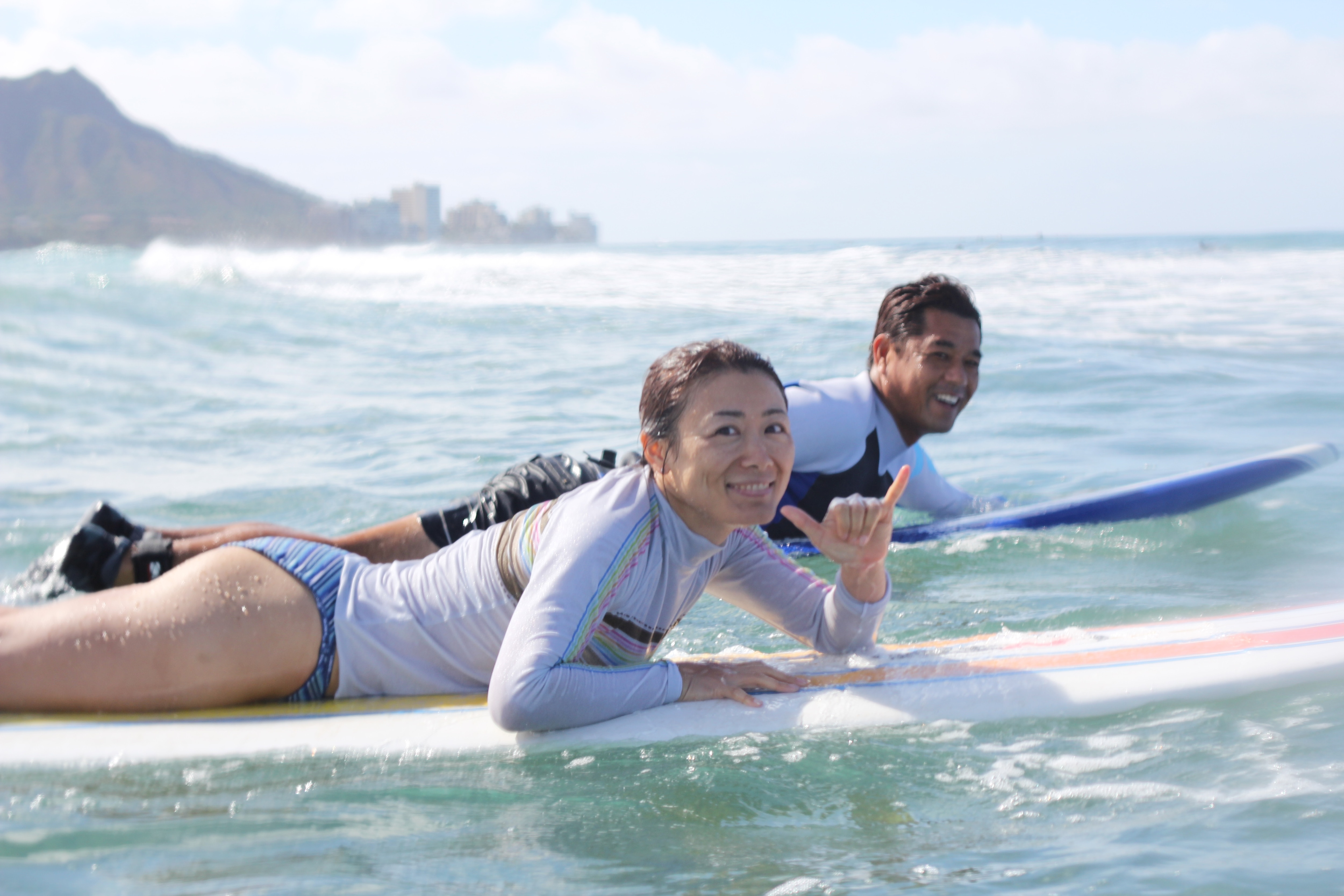 ハワイの青い空の下、ダイヤモンドヘッドを背景に、サーフィンを楽しんでみませんか?