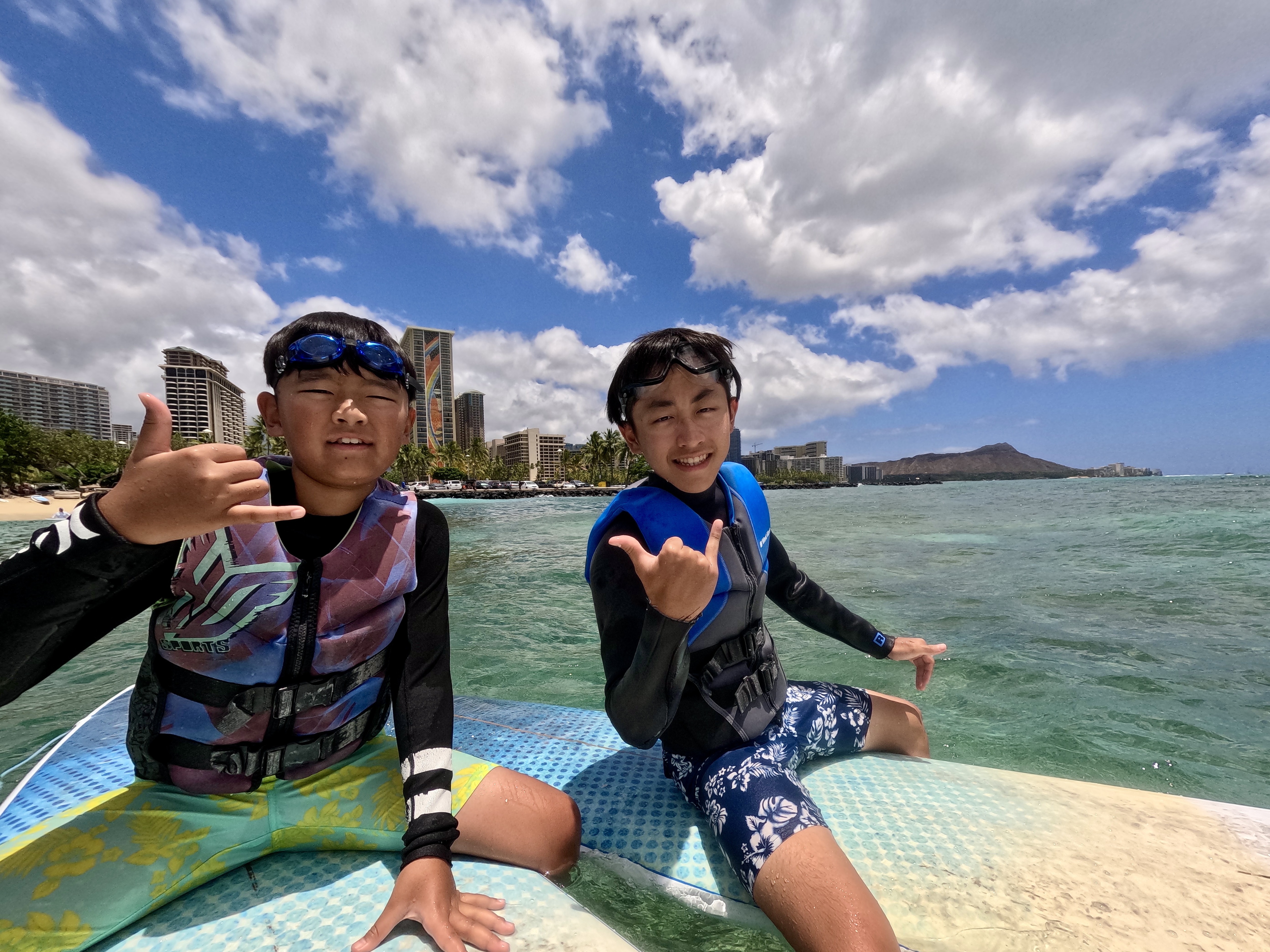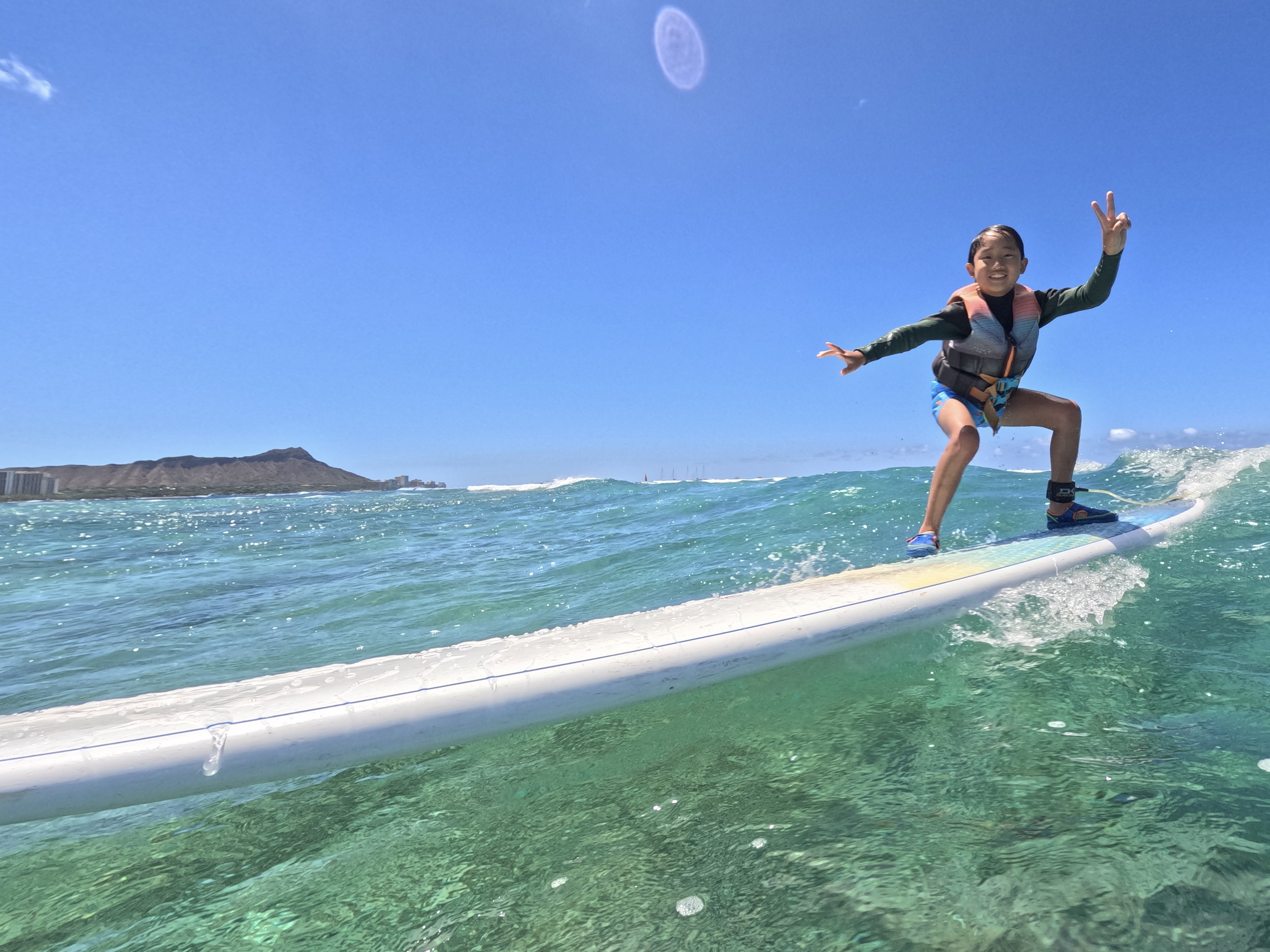 ハワイの青い空の下、ダイヤモンドヘッドを背景に、サーフィンを楽しんでみませんか?