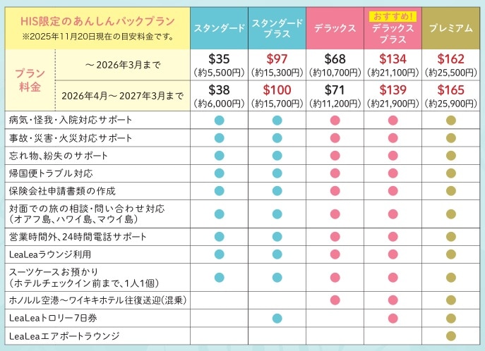 ・スタンダードプラン、デラックスプランはホノルル滞在(周遊を含む)の場合に適用になります。