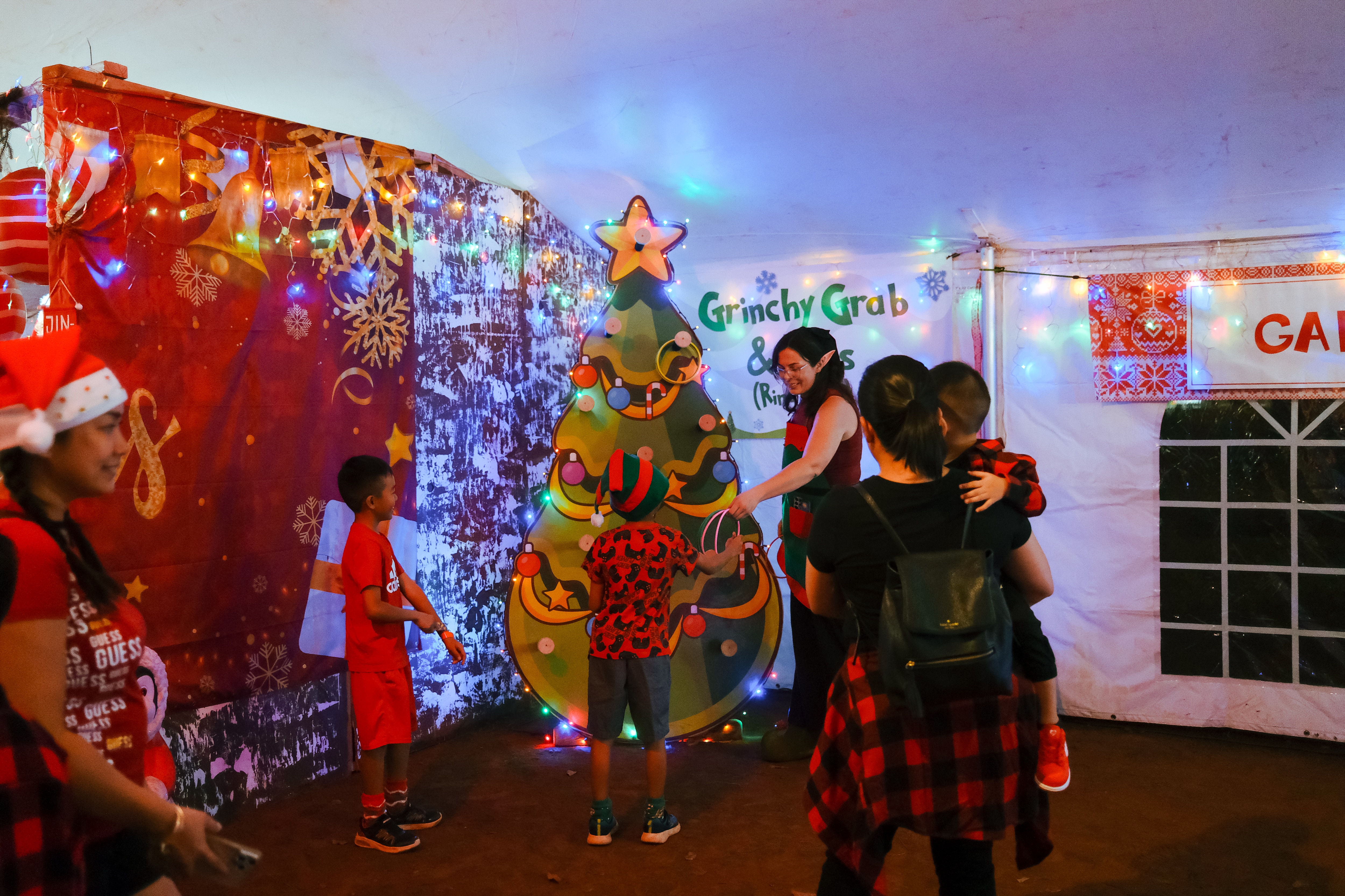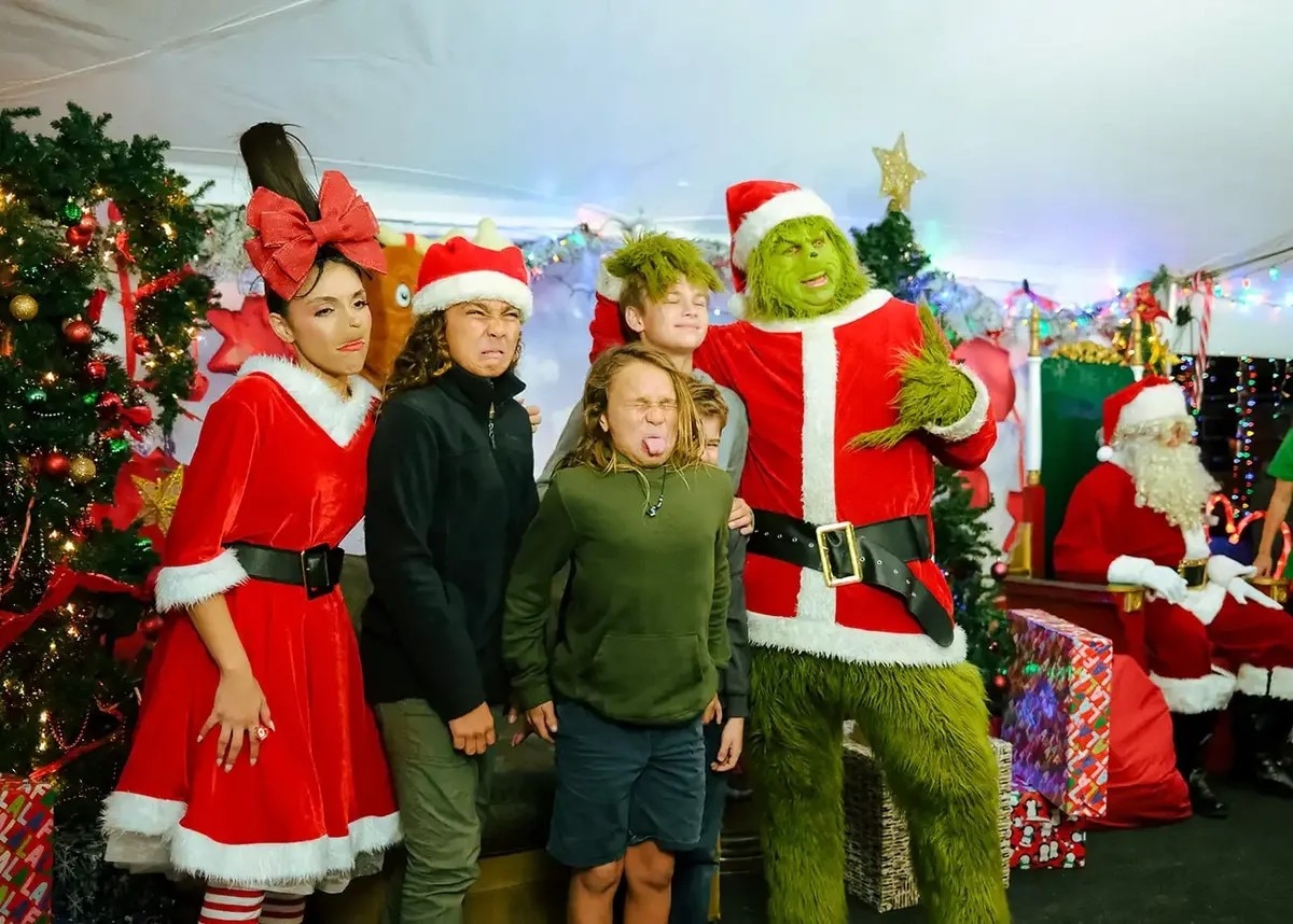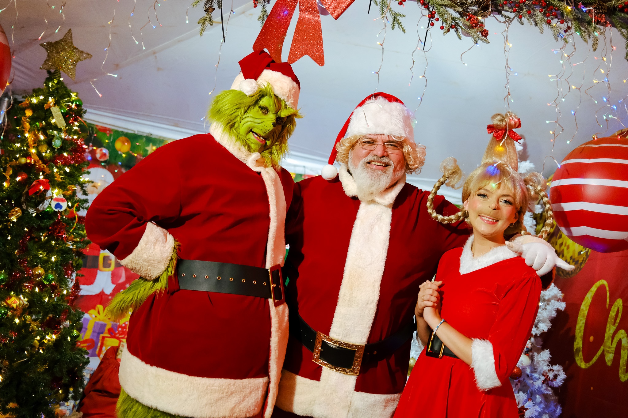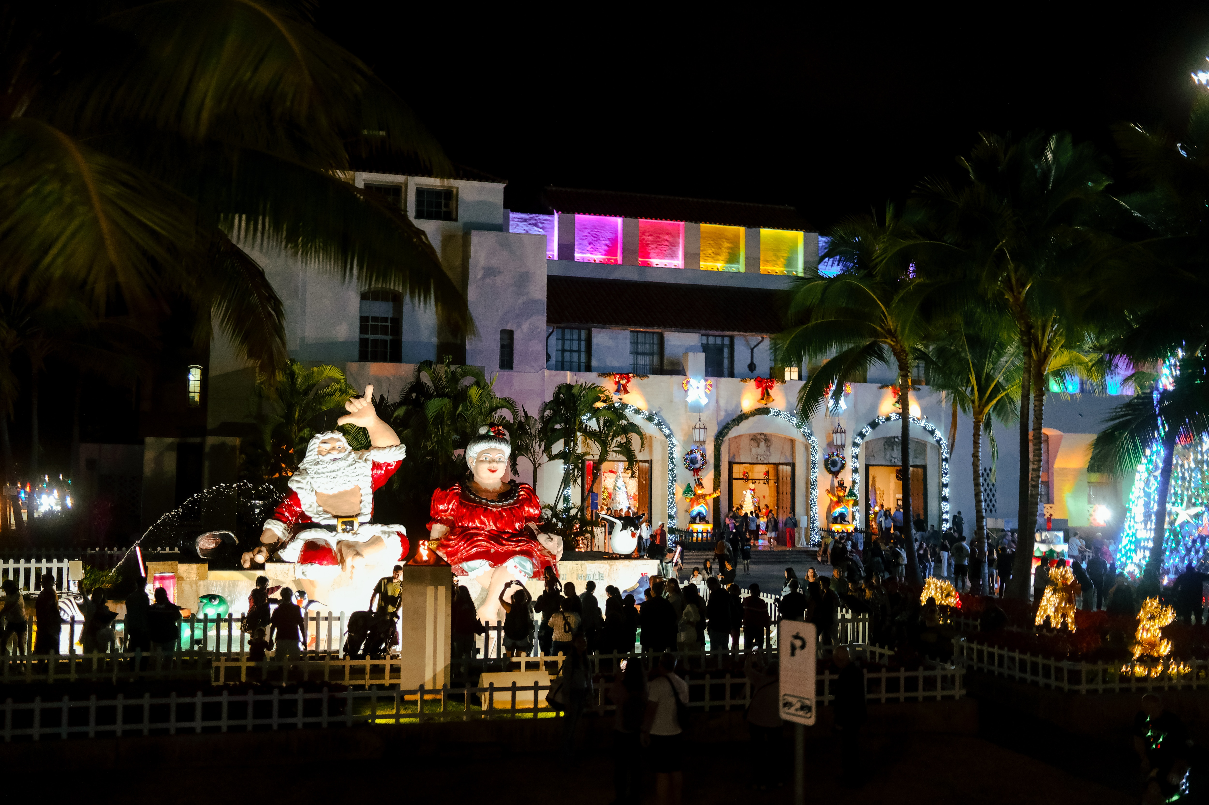 いかにもハワイらしいシャカサインにムームー姿のミスター&ミセス・サンタ、高さ約50フィートのクリスマスツリーやハワイアンスタイルのスノーマン・ファミリーなど、見どころいっぱい!