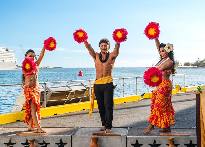 アロハタワー・マーケットプレイス ピア8へ到着, アロハタワー・マーケットプレイス ピア8へ到着, ウェルカムフラ |