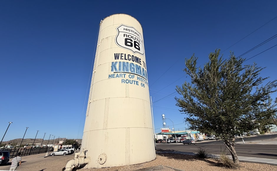 ルート66の宿場町キングマン駅横の給水塔で写真撮影 |