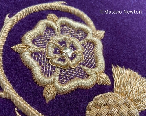王室公式刺繍を多数担当し、キャサリン妃のウェディングドレス刺繍制作チームの一員としても知られます。