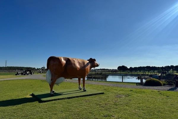 のどかな牧場で放牧中の牛や羊を見学、ファームメイドのスイーツやコーヒーをカフェで楽しむブレイクタイム(購入は各自負担) |