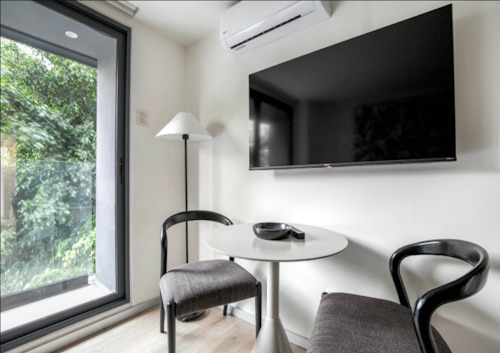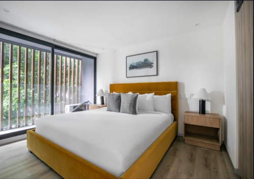 サービスアパートメントの場所は独立記念塔から徒歩7分、閑静な住宅エリアにあり、徒歩圏内に飲食店(和食やメキシコ料理など)やコンビニ(OXXO)もございます。