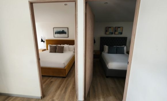 約50~60㎡のお部屋には寝室(キングサイズ1台&クイーンサイズ1台)、リビングルーム(キッチン併設)、バスルーム(トイレ併設、バスタブなし)、ソファーベッド。