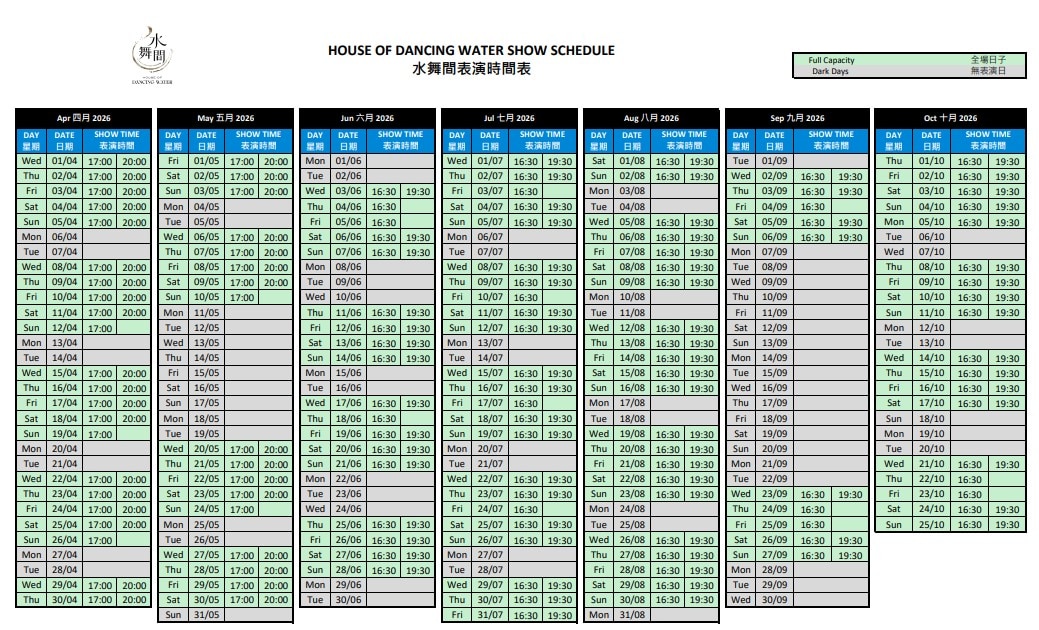 基本的に月火が休演日ですが祝日などのある週は前後します。2026年4・5月は日によって17:00、20:00があります。2026年6月以降は16:30、19:30があります。詳細は上記にある画像からスケジュールをご確認ください。