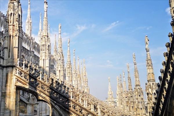 まず、エレベーターで屋上に上がって、テラスからミラノの市内景色をお楽しみいただきます。このツアーはガイドと一緒に入場するので、ドゥオモのエレベーターは優先入口からの乗車となり、一般入場の見学者より早くエレベーターに乗車できます。屋上ではゴシック建築の特徴である壮麗な飛梁と尖塔、そして、下から見るのではわからない細工の施された尖ったアーチや彫像を間近で鑑賞することができます。頂上にある黄金のマリア像にミラノ再訪を祈ると叶うという言い伝えがあるだそうですので、ぜひ願掛けしてみてください!