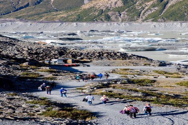 モレーンの地形(氷河が谷を削りながら時間をかけて流れる時、削り取られた岩石・岩屑や土砂などが土手のように堆積した地形)を抜け、タスマン氷河と氷山が点在する湖を見下ろす展望台へ向います。