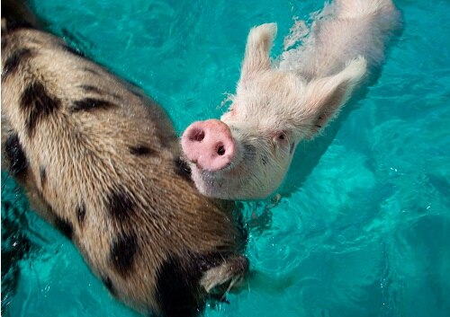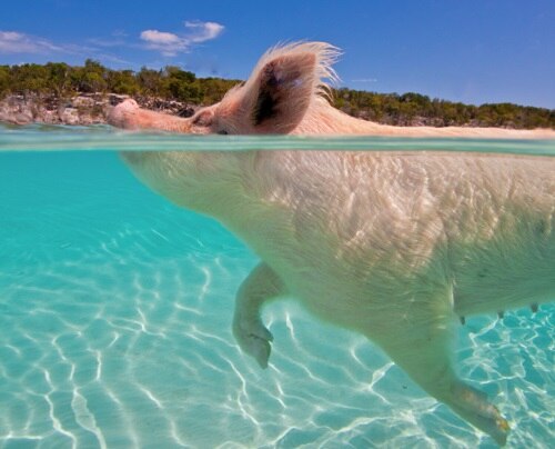 そんなエグズーマ諸島のスタニエルスキーからボートで少し行くとなんと泳ぐ豚さんビーチ(Big Mayor Cay)が!