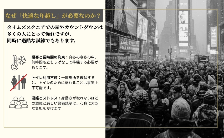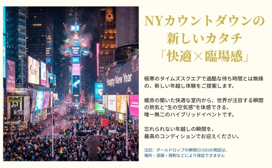 喧騒の外で、世界一有名なカウントダウンを。 あったか室内で、混雑ゼロの特別体験。