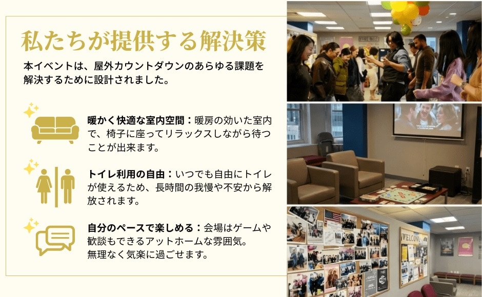 ・本イベントは、年越しの時間をゆったりと過ごすことを中心とした内容です。特定の演出や景色の観覧を目的としたイベントではありません。