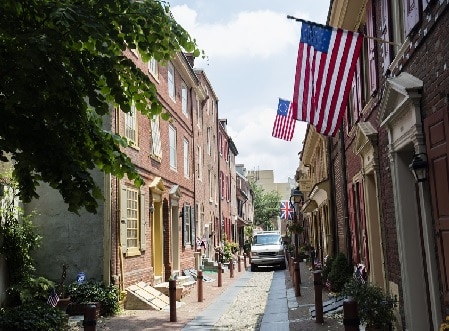 その後米国最古の住宅街、エルフレス小径を散策。 続いて、フィラデルフィア旧市街、金融街、ベンジャミンフランクリンパークウェイ、ロッキーステップなどを概観します。 |