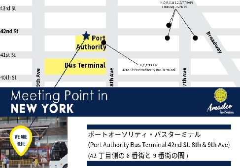 ポート・オーソリティ・バスターミナルの北側(42nd ストリート側)の出入り口外側 (※8th Ave.と9th Ave.の間)※係員がおりますので、お申し出ください。 |