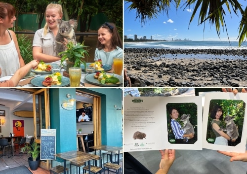 日本語往復送迎、カランビン動物園入園、コアラと一緒に朝ごはん、コアラ抱っこ写真、バーレーヘッズビーチ散策