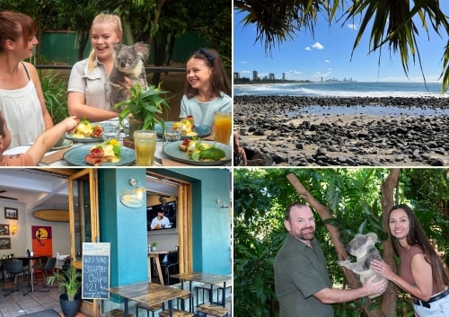 日本語往復送迎、カランビン動物園入園、コアラと一緒に朝ごはん、コアラとの記念写真、バーレーヘッズビーチ散策