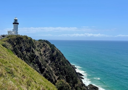 シンボルの白い灯台からは、オーストラリア大陸最東端から眺める真っ青な太平洋が。