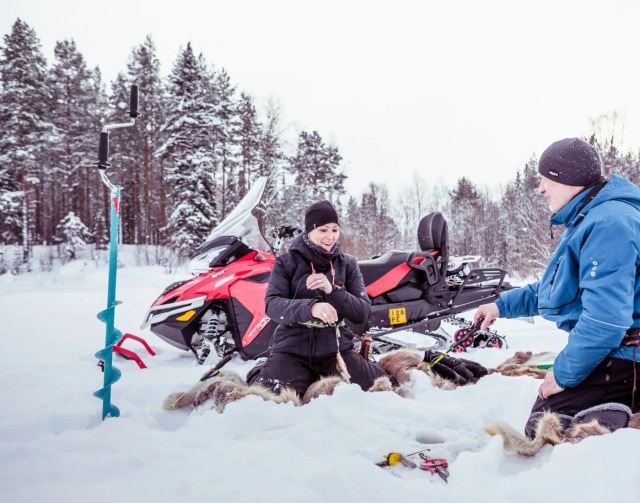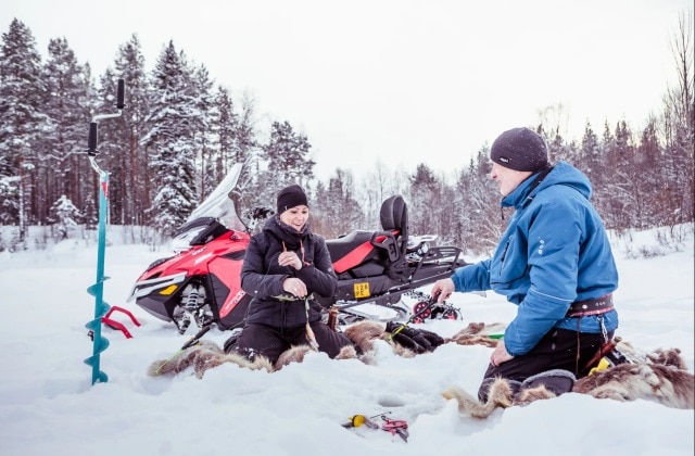 ドリルを使って氷に穴をあけたら 、いよいよアイスフィッシングに挑戦。ラップランドの澄んだ水に泳ぐ美しい魚、北極イワナが釣れることもあります。