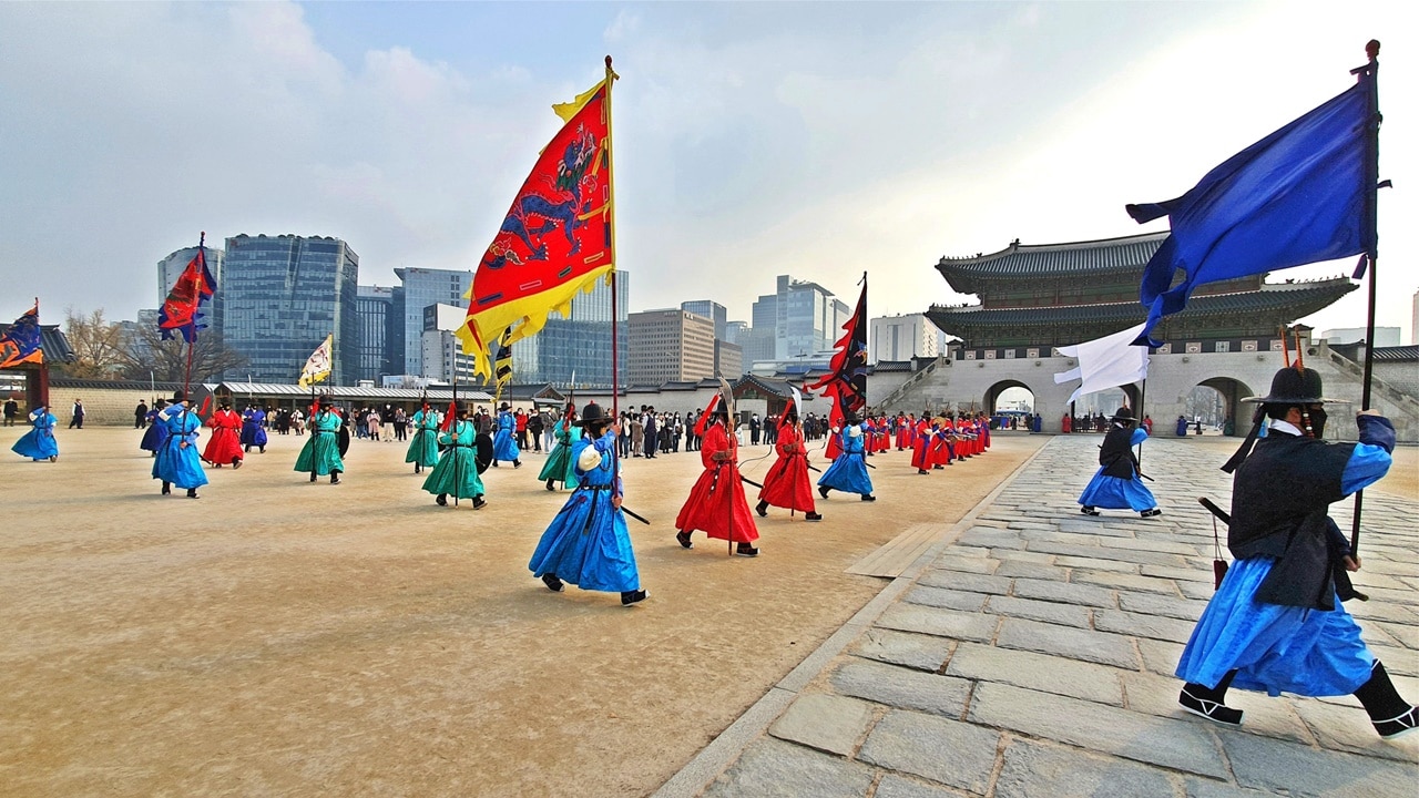 朝鮮時代に行われた王宮の門の開閉や、警備を担っていた守門軍の交代儀式です。景福宮で開催される守門将交代式は、それぞれ役職の異なる軍士が多く登場し、号令と楽器の音色が鳴り響き、それに合わせて鮮やかな旗が振られ、立ち位置などが変わる迫力がある儀式を見ることができます。