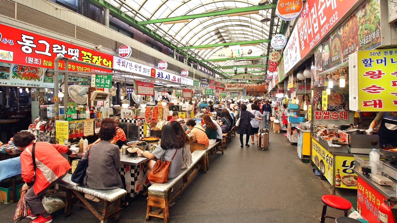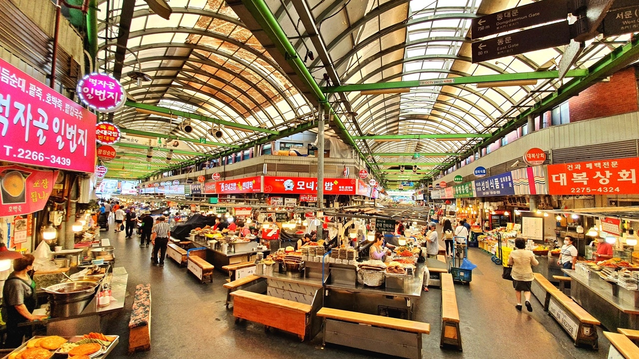 市場の中には飲食の屋台が建ち並んでいて、野菜たっぷりビビンバに、直接緑豆をその場でひいて焼いてくれるピンデットッ、中身がたっぷり詰まったスンデにカルグクスや海苔巻き、チジミ、餃子、お刺身にユッケなどメニューもいろいろあります。