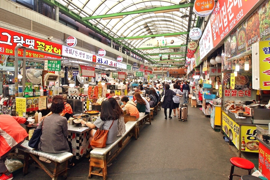 1905年に政府の許可を得てつくられた国内最初の公設市場で、市場の中央通りには飲食の屋台が建ち並んでいて、野菜たっぷりビビンバに、直接緑豆をその場でひいて焼いてくれるピンデットッ、中身がたっぷり詰まったスンデにカルグクスや海苔巻き、チジミ、餃子、お刺身にユッケなどメニューもあります。