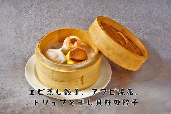 ・エビ蒸し餃子、アワビ焼売、トリュフと干し貝柱の餃子