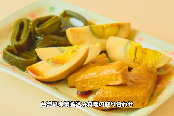 • おつまみ:フルーツ風味の黄金キムチ(小)、台湾風冷製煮込み料理の盛り合わせ、冷製エリンギの金沙(塩卵黄)和え
