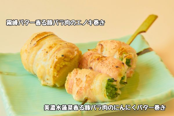 • 厳選串焼き:美濃水蓮菜香る豚バラ肉のにんにくバター巻き、霧峰バター香る豚バラ肉のエノキ巻き 各1本