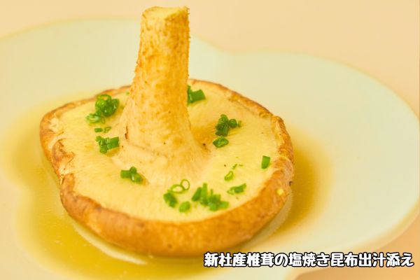 • 厳選串焼き:美濃水蓮菜香る豚バラ肉のにんにくバター巻き、霧峰バター香る豚バラ肉のエノキ巻き、新社産椎茸の塩焼き昆布出汁添え 各2本