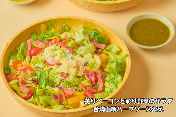 • 薫りベーコンと彩り野菜のサラダ、台湾山椒ハーブソース添え