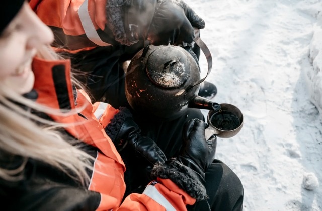 農場でコーヒーを楽しみながら、トナカイにまつわる物語に耳を傾け、バスでレヴィに戻ります。 |